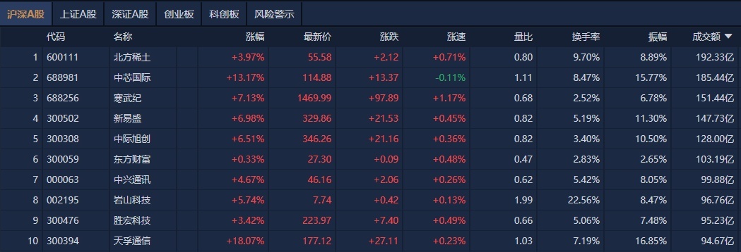 沪深两市半日成交额1.79万亿元,较上个交易日放量617亿。个股方面,北方稀土成交额超192亿元居首,中芯国际、寒武纪、新易盛成交额靠前。